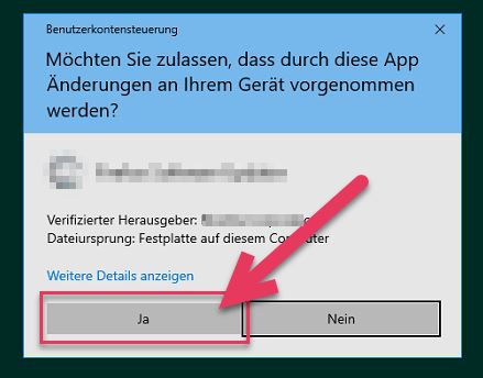 Nun kommt möglicherweise ein Fenster der "Benutzerkontensteuerung". In diesem Fenster auf "Ja" klicken